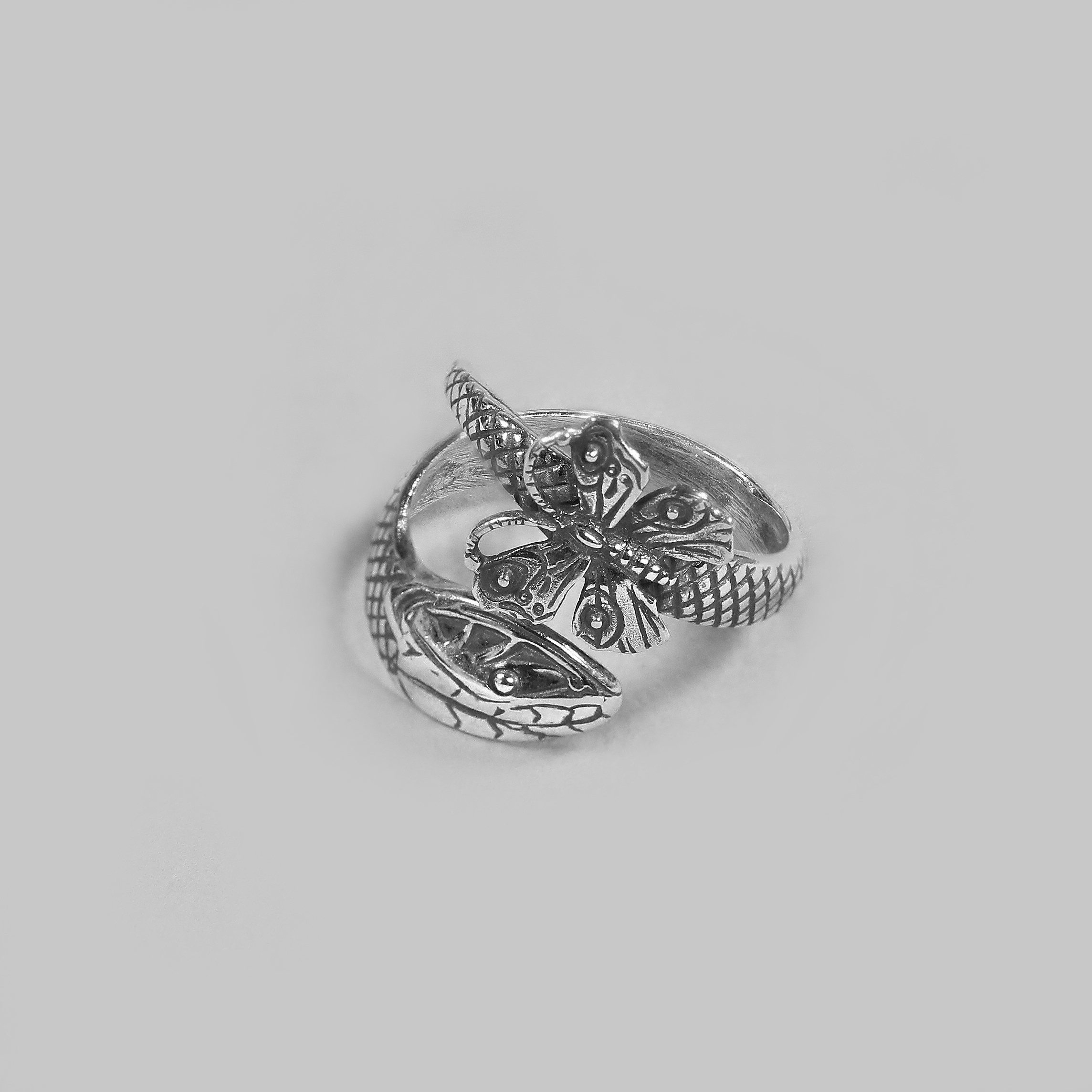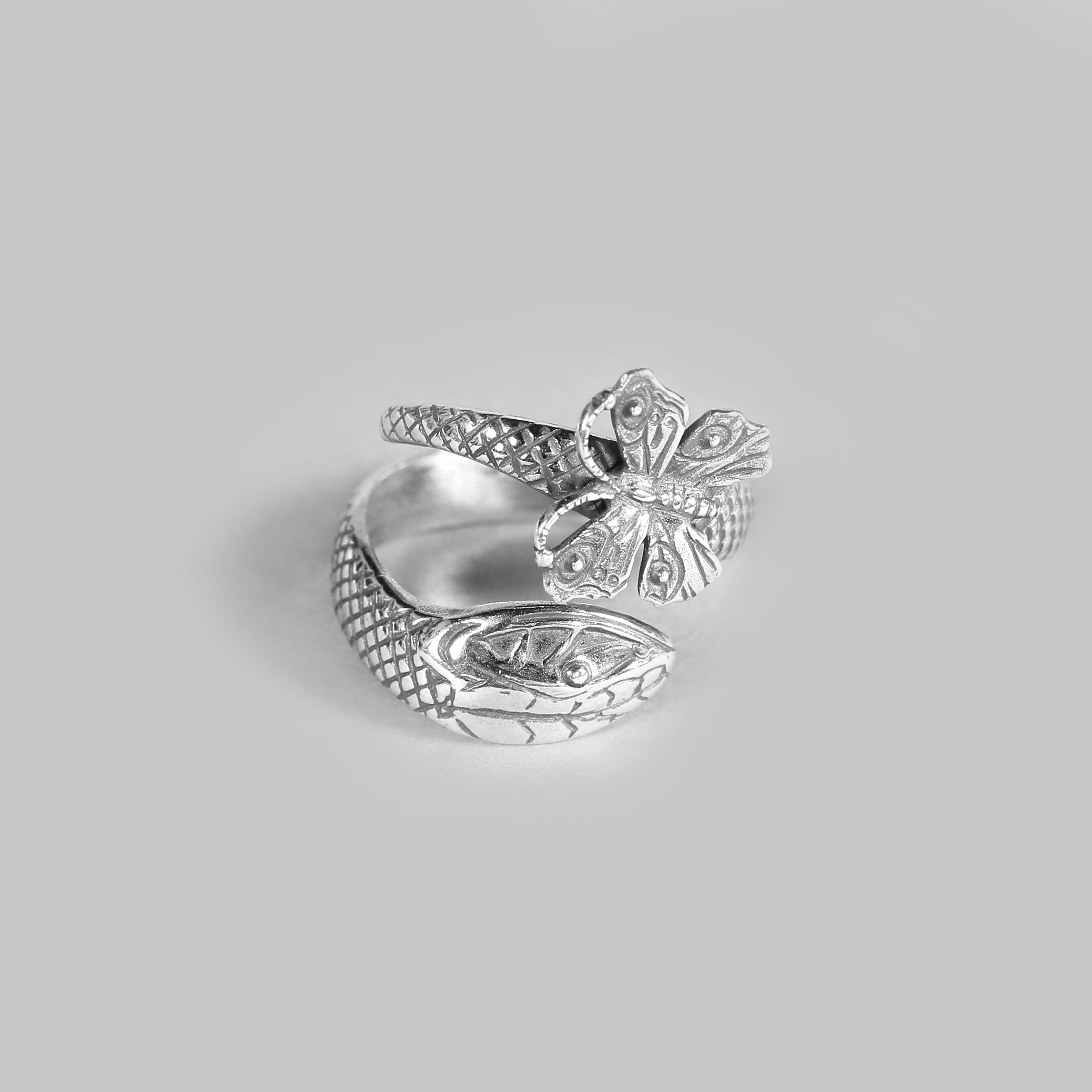 Art Nouveau Style Snake & Butterfly Open Ring In Sterling Silver.