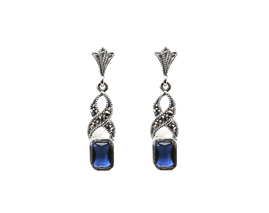 Beautiful Art Deco Style Earrings In Sapphire, Marcasite & Sterling Silver.