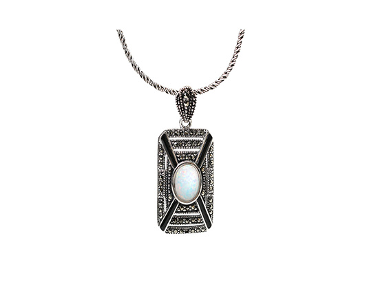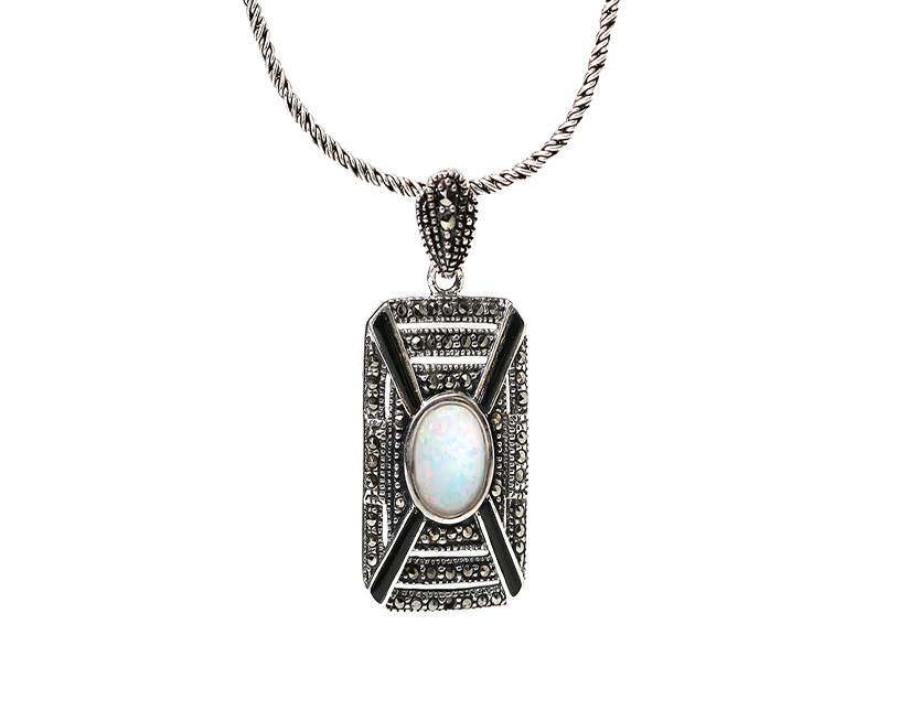 Beautiful Art Deco Style Pendant In Black Onyx, Gilson Opal, Marcasite & Sterling Silver.