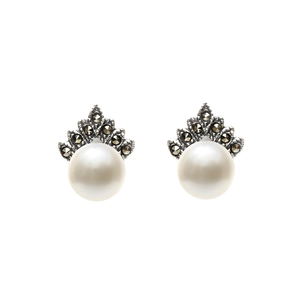 Beautiful Art Deco Style Real Fresh Water Pearl Crown Studs In Marcasite & Sterling Silver.